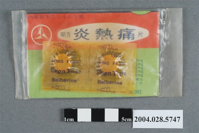 1. 本物件為炎熱痛。外包裝為塑膠袋,內有說明物件和藥片包裝。說明物件應為紙製品,封面印有明方、新消炎解熱止痛藥、炎熱痛片和炎熱痛,以及三張圖片,分別代表消炎、退熱和止痛。背面被藥片包裝遮住部分字樣,可見商標、明方炎熱痛片和衛字4773字樣,以及主治效能、用法用量和成分內容。內有2片藥片包裝,藥片被透明膠膜包住,其上印有Enga Tone和Belberine字樣。