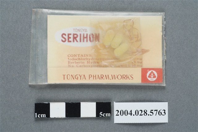 本物件為東亞瀉痢好。最外層包有塑膠封袋,本藥是藥丸形式。包裝正面印有「東亞瀉痢好」字樣、主治和用法資訊,右上角印有人在蹲式馬桶上廁所的示意圖。此藥治療急性慢性腸胃炎、腹瀉和食傷等。背面印有相對應之英文內容。