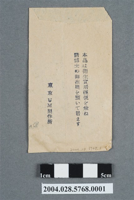本物件為文化偏眼帶紙袋。紙袋兩面有字,紙袋頂端有開口。一面印有「文化偏眼帶」字樣,另稱即護眼罩,另一面印有「本品は衛生實用輕便を兼ね」、「諸博士の御推獎を預いて居ます」與「東京UM製作所」字樣。