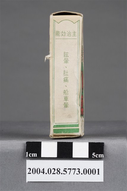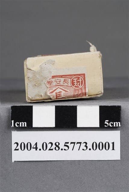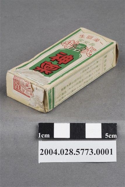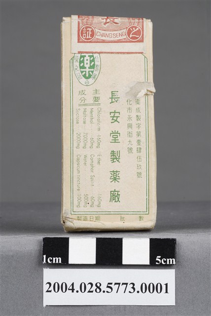 1. 本物件為長安堂神藥外盒。外盒長方體,表面底色為白色。封面底圖為藥瓶圖案,瓶身印有神藥二字,另盒身印有一滴回生、長安堂和成藥字樣。背面印有主要成分和製藥廠資訊內容,因盒面有些許破損,利用說明書內容輔助辨識,藥廠應在彰化以及許可字號為內衛成製字第1459號。側面分別印有用法用量和主治效能:眩暈、肚痛和車船暈。上下盒蓋皆貼有封緘。