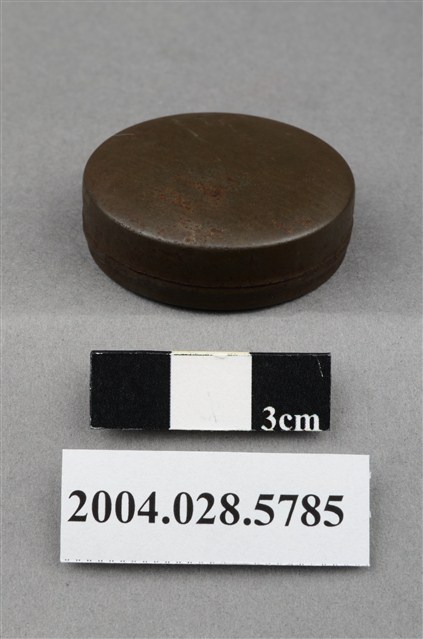 本物件為藥盒。藥盒外觀生鏽,字體與圖案模糊不清,扁平圓盒,盒子底部黏有一標籤寫有「706D」。