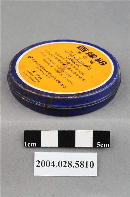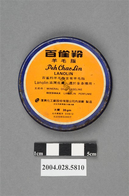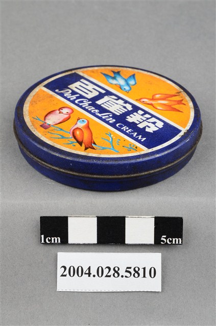 1.本件復興化工廠製百雀羚羊毛脂可分為盒蓋與盒身2部件,以鋁金屬製作,外型呈圓形餅狀,表面作彩色印刷,為長7.4公分,寬7.4公分,高1.3公分。盒蓋外緣帶唇,盒身口緣略為收斂,採套合式開闔。表面以深藍色為底,於正面作橘色圓底框,以深藍色橫式長方形框分隔上下半圓,框內印有白字「百雀羚」中英文字樣,上半部以橘色與藍色雀鳥向下飛翔姿態裝飾,下半部則以2隻雀鳥休憩於枝頭裝飾。底面採相同橘色底框,於框內印上黑色「百雀羚羊毛脂」中英文字樣,以及產品特色與成份,底端則有製造廠商「復興花工廠股份有限公司內湖廠製造」與地址。2.本件臺灣製造之百雀羚羊毛脂為早期臺灣婦女經常使用的護膚品,由於原料單純,塗抹於皮膚具有滋潤卻不油膩的特點,更帶有花香味,至今仍深受民眾喜愛,並持續生產販售。