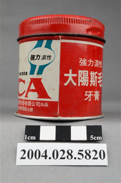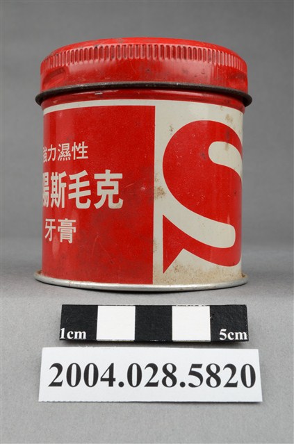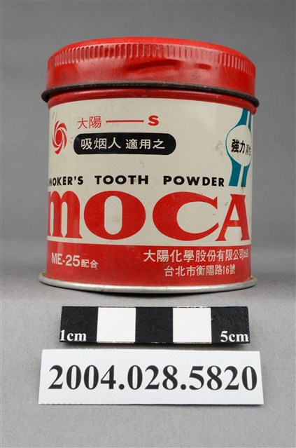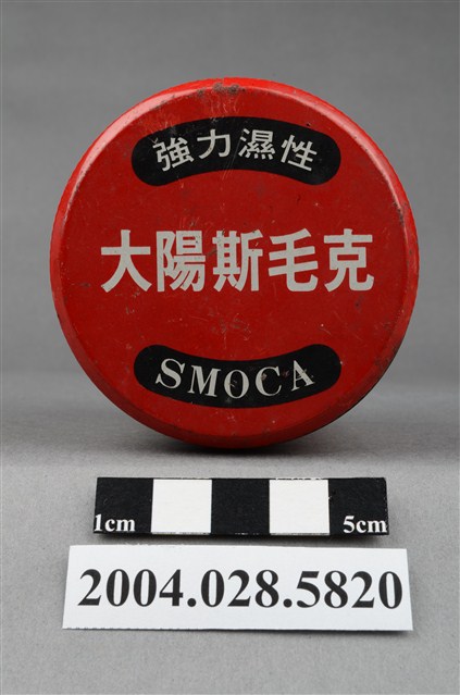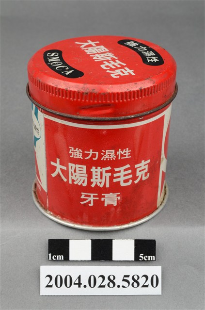 本件大陽化學股份有限公司製斯毛克強力濕性牙膏,應仿製日本傳統牙粉品牌SMOCA。牙膏可分為罐蓋與罐身2部件,外觀呈圓筒狀鐵罐,於表面作紅、白、藍與黑色4色印刷。罐蓋表面以紅色為底,頂面中央橫書白字「大陽斯毛克」,上下邊各以曲面長橢圓形黑底框內印「強力濕性」與「SMOCA」,側身內層帶有螺旋紋,可與罐身作旋轉開闔。罐身以白色為底作橫式長方形版面設計,「SMOCA」紅色字樣為大標題布滿版面約3分之2中段處,上方印有「SMOKER'S TOOTH POWDER」,頂端為紅色漩紋大陽商標,右側帶有「大陽-S」,下方為長橢圓形黑底框,內作白字「吸烟人適用之」,其右側以2條斜下藍色帶於中間左右撐開成白底圓框,內帶「強力濕性」字樣。標題下段則以紅色帶狀為框,內有「ME-25配合」、「大陽化學股份有限公司出品」、「台北市衡陽街16號」。標題之左側以長方形紅底白字標示「強力濕性大陽斯毛克牙膏」。