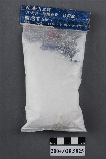 1.本件為天香化工股份有限公司製雪泡洗衣粉。洗衣粉以直式方形透明塑膠袋包裝,頂端以厚紙板封口。透明塑膠袋上頂端印有天香公司的紅色標章,往下是天香洗衣粉「SAPO」藍色英文字體,再往下是「天香」、「雪泡」、「洗衣粉」、「太空包」,以紅字印製品名與包裝別。底端以藍字印刷「天香化工股份有限公司出品」。頂端厚紙板正面為紅、黃兩色相間;背面為藍色紙板,正面印刷「雪泡」、「超級!」、「強力!」,背面印「天香有三寶:VP肥皂,檸檬香皂,和雪泡」、「雪泡有五好:好泡,好洗,好沖,好白,香味好」之廣告標語。保存狀況不佳,外包裝塑膠袋破裂,包裝袋左中處暫時以透明膠帶黏起,但仍有不少灑落於包裝周圍。2.天香化工原廠址在日治時代為「花王有機株式會社」,二戰後短暫為油脂紙業接管委員會接收,後在1950年開放民營,遂改名為天香化學股份有限公司。1960年代開始,天香化工生產本件產品——天香雪泡。當時公司透過各種行銷手法,如在電視臺開設節目(節目名為「天香之夜」),每週以半小時推銷此洗衣粉,讓「天香雪泡」成為1970年代洗衣粉的銷售龍頭,為當年家喻戶曉的清潔用品。