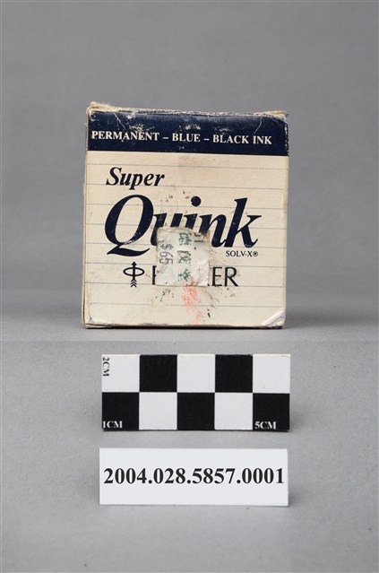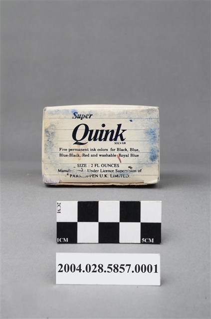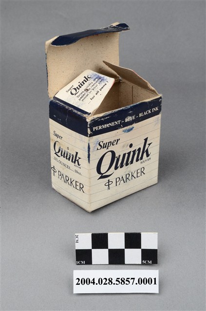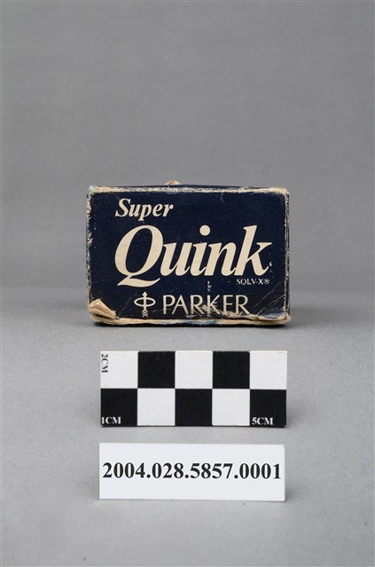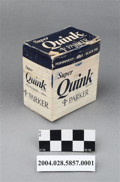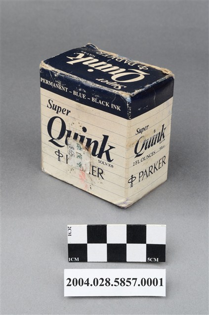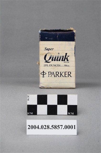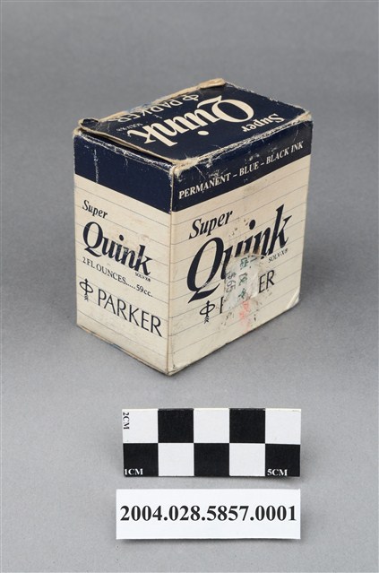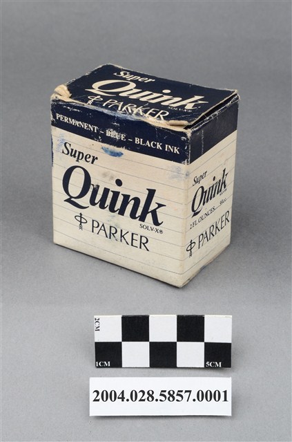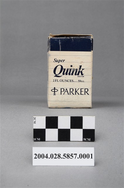 本文物為PARKER/派克瓶裝藍黑色墨水瓶(含外盒),派克鋼筆公司(Parker Pen Company)1888年由喬冶‧斯坦福‧派克於美國威斯康辛州簡斯維爾市成立,是歷史悠久的製筆公司。本物件為臺灣製造,外盒包裝標籤完整。