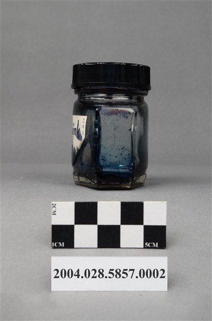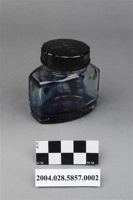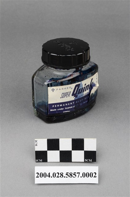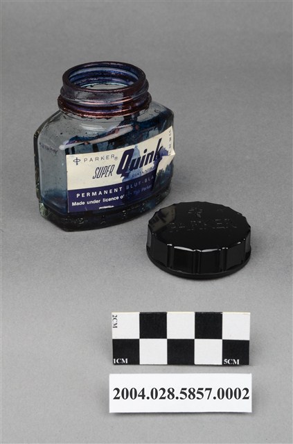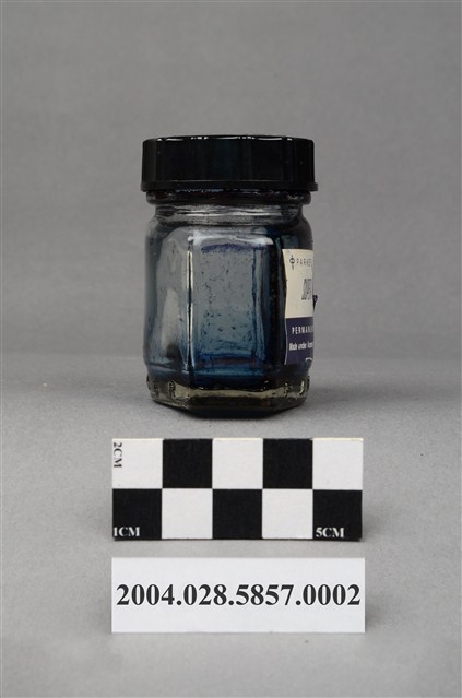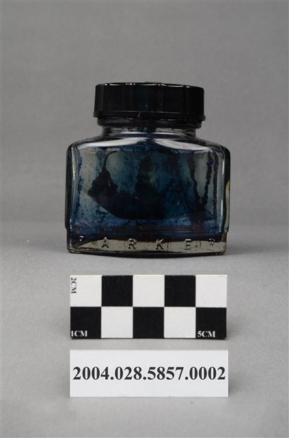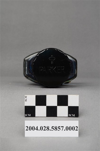 本文物為PARKER/派克瓶裝藍黑色墨水瓶(含外盒),派克鋼筆公司(Parker Pen Company)1888年由喬冶‧斯坦福‧派克於美國威斯康辛州簡斯維爾市成立,是歷史悠久的製筆公司。本物件為臺灣製造,外盒包裝標籤完整。