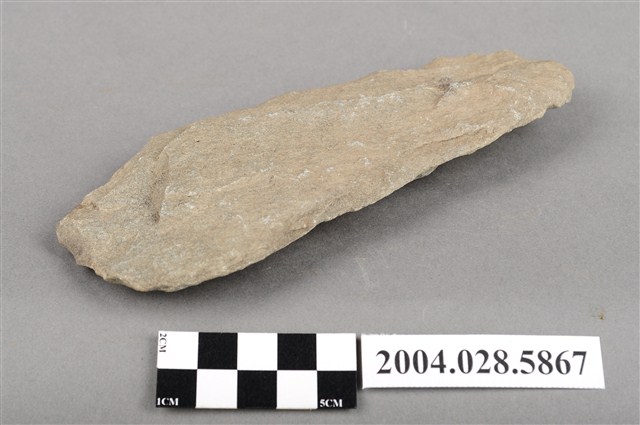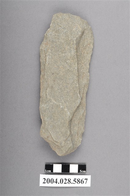 2.打製石斧常見於臺灣的史前遺址,為史前人類用作劈砍的工具,使用前於器身柄端以線繩纏繞綁縛木柄使用。由於石斧在地層中埋藏幾千年後,木柄的部分已腐爛風化,只剩下石質部分遺留下來。