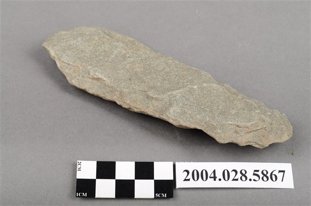 1.本件為花蓮支亞干遺址採集之打製石鋤,材質為變質砂岩,器形近長方形,長16.8cm、寬6.5cm、厚2.3cm,器身周緣經過修整,打剝痕明顯,尤其在側邊有明顯的破裂面,器身兩端原作為刃部使用,可能因破損造成缺角,此外器身大致保存完整,刃部為中鋒。