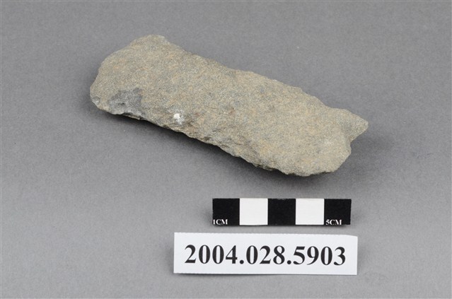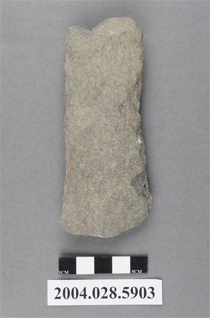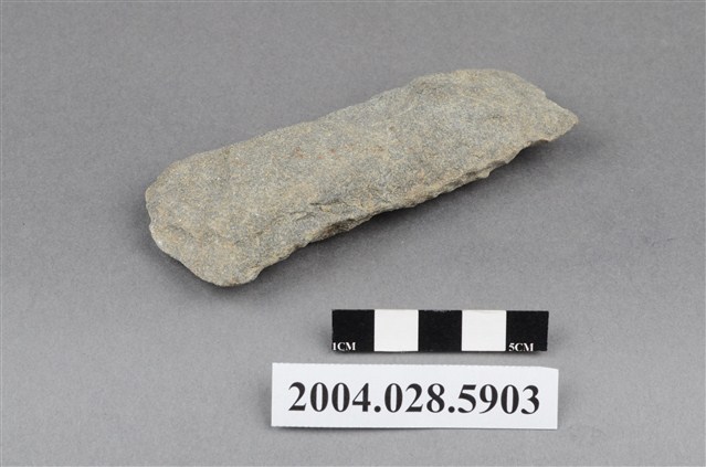 2.打製石斧常見於臺灣的史前遺址,為史前人類用作劈砍的工具,使用前於器身柄端以線繩纏繞綁縛木柄使用。由於石斧在地層中埋藏幾千年後,木柄的部分已腐爛風化,只剩下石質部分遺留下來。