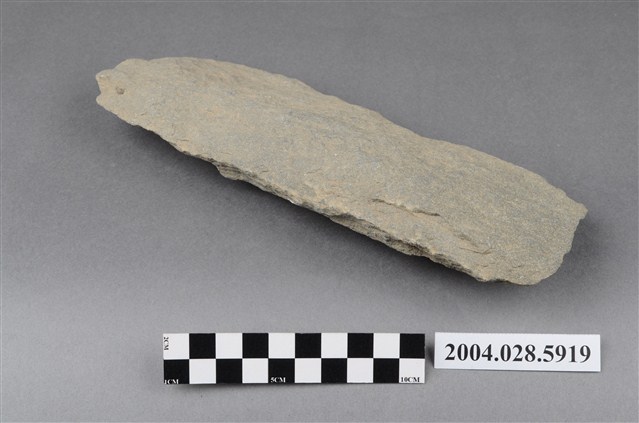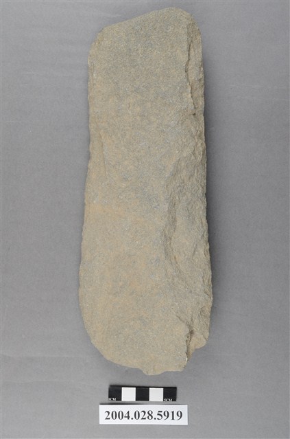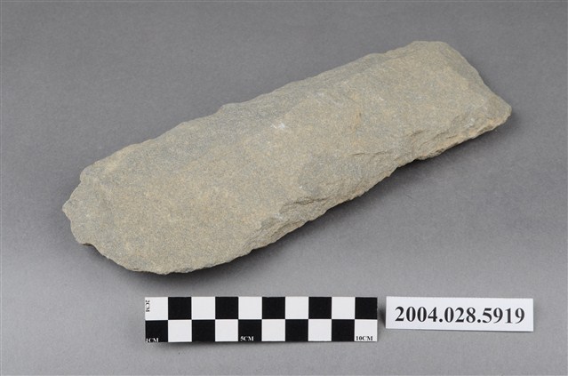 1.本件為臺東樟原遺址採集之打製石斧,材質為灰色砂岩,器長24.8cm、寬9.2cm、厚3.5cm,器形為長方形,保存完整,器身一面保留原來之石皮,另一面及側邊經過修整,柄部為一斜面,刃部為中鋒,經使用有明顯的消耗痕。