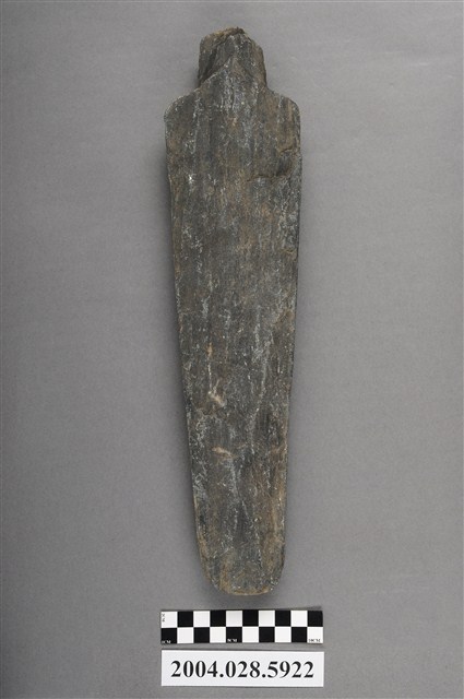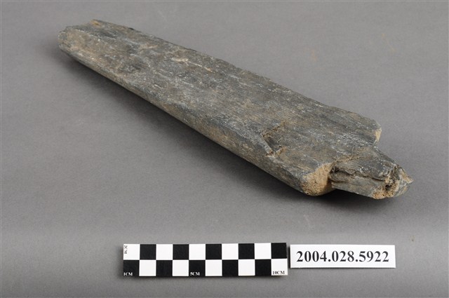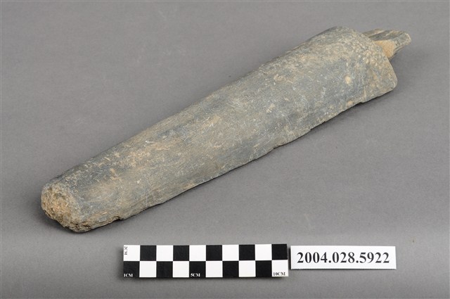 1.本件為花蓮港口遺址採集之磨製石杵,材質為深灰色硬頁岩,長32.9cm、寬7.8cm、厚4.1cm,器形為圓柱體,已經破損,殘存半件,器物表面經過磨平,器身兩端的粗細不同,一端較細並經錘擊使用,另一端較粗,鑿刻出頸部細窄之突起,作為裝柄部分,器型非常罕見。保存不完整。2.石杵為史前人類用來舂穀去殼的工具,使用前用繩索綁縛在木柄上舂打,由於木質部分埋藏地層中過久,已經腐爛不見,只有石質部分遺留下來。