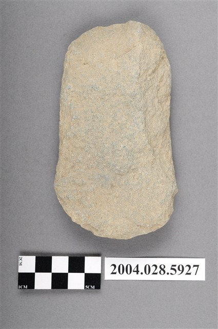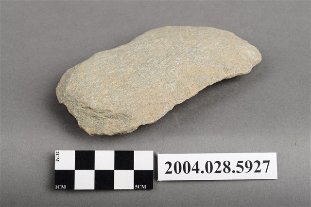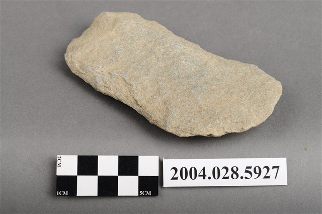 2.打製石斧常見於臺灣的史前遺址,為史前人類用作劈砍的工具,使用前於器身柄端以線繩纏繞綁縛木柄使用。由於石斧在地層中埋藏幾千年後,木柄的部分已腐爛風化,只剩下石質部分遺留下來。