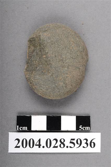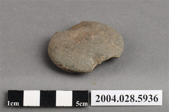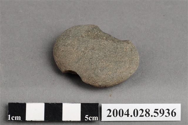 1.本件為臺東南八里遺址採集之打製砝碼型石網墜,材質為灰色變質砂岩,長5cm、寬4.2cm、厚1.5cm,器形為扁圓形,本件器物由扁圓礫石簡單製作而成,表面未經加工,僅在器身兩側中央敲擊,形成相互對稱的凹槽,凹槽一大一小。2.打製砝碼型石網墜常見於臺灣的史前遺址,為史前人類用來綁在漁網上進行漁撈活動時使用的工具,因漁網埋藏地層中數千年之久,纖維質已經腐爛不見,只有石質部分遺留下來。