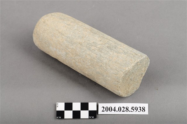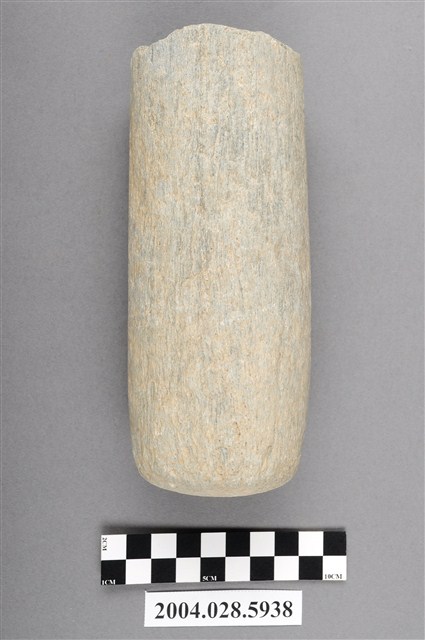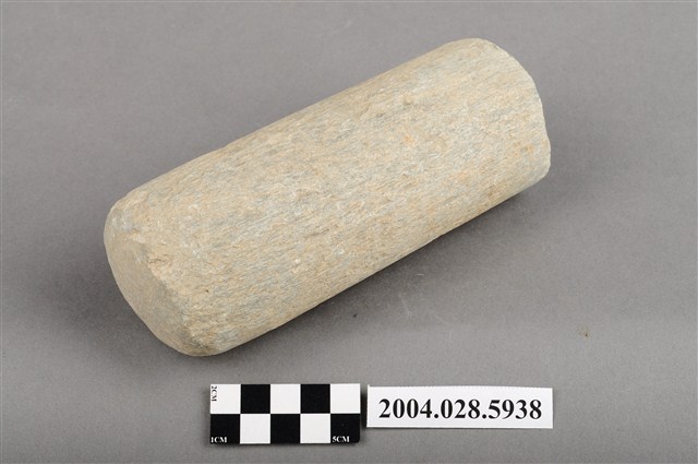 1.本件為花蓮靜浦遺址採集之打製石杵,材質為灰色片岩,長16.3cm、寬6.6cm、厚5.7cm,器形為圓柱體,上下圓徑相同,保存不完整,一端已經破損,器物表面經過打剝修整但未經打磨,另一端經錘擊使用,成一弧面。2.石杵為史前人類用來舂穀去殼的工具,使用前用繩索綁縛在木柄上舂打,由於木質部分埋藏地下過久,已經腐爛不見,只有石質部分遺留下來。
