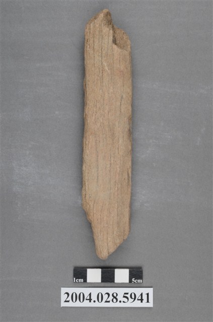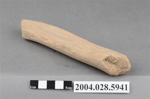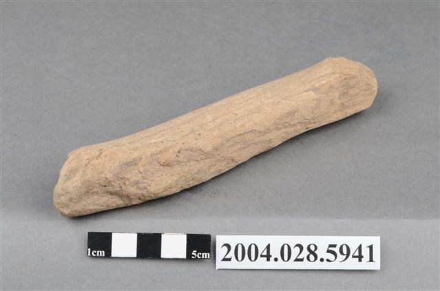 1.本件為花蓮支亞干遺址採集之打製石杵,材質為灰色片岩,長17.3cm、寬3.4cm、厚2.6cm,器形為長條形,器身並不圓,表面經打剝修整但未打磨,局部為石材原狀。一端突出但有凹損,經過錘擊使用,另一端為三角形。2.石杵為史前人類用來舂穀去殼的工具,使用前用繩索綁縛在木柄上舂打,由於木質部分埋藏地下過久,已經腐爛不見,只有石質部分遺留下來。