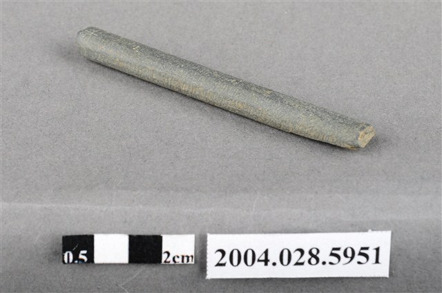 1.本件為花蓮掃叭遺址採集之磨製石針,材質為灰黑色板岩,器長5.3cm、寬0.6cm、厚0.5cm,器形為扁圓形,器身磨製成長條型,兩端均已折斷。2.本件器物常在臺灣的史前遺址發現,推測為史前人類用來穿孔之工具。