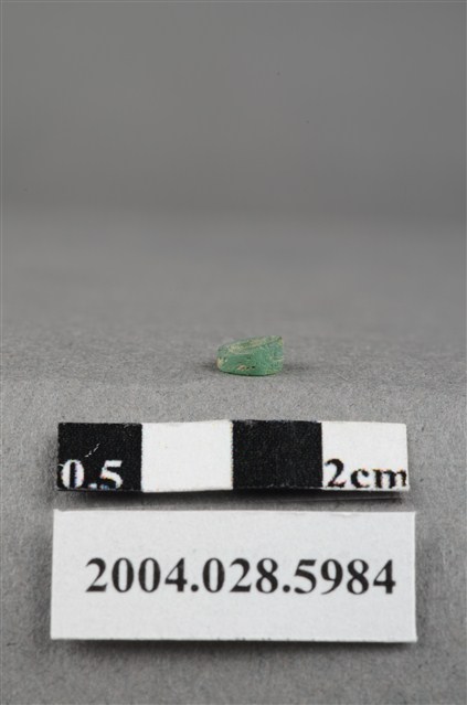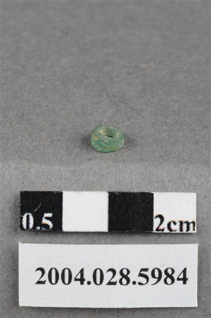 1.本件為花蓮港口遺址採集之玻璃珠,形制為扁圓形,,直徑0.3cm、厚0.1cm,經燒製而成,色澤均勻,呈現綠色,有一中空的圓孔,表面尚還保留原始的捲製痕跡。2.玻璃珠大多為鐵器時代史前人類以物易物交換得來的舶來品。由於數量並不多,較為珍貴,所以玻璃珠也成為史前人類相當重要的一種裝飾品。