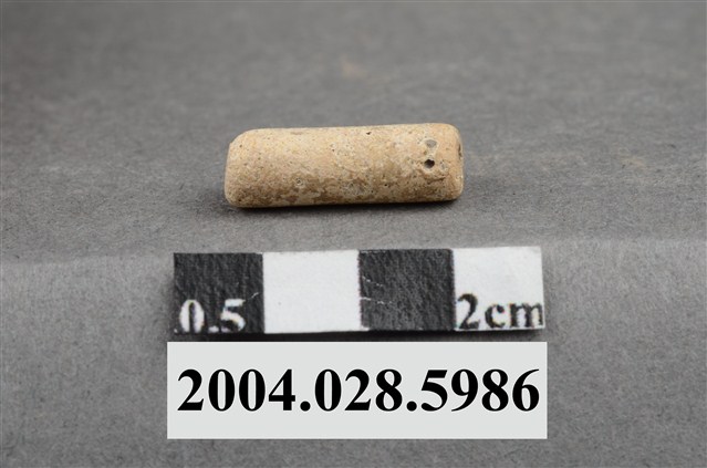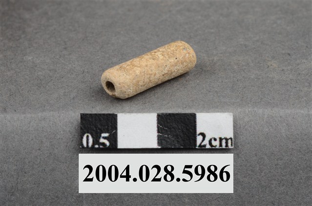 1.本件為花蓮港口遺址採集之貝管珠,形制為圓形,長1.3cm、管徑0.4cm,經磨製而成,表面勻稱,呈現灰色,有一中空的圓孔。2.管珠常見於臺灣的史前遺址,大多為史前人類的裝飾品,材質最常使用的是美麗的玉石,貝製品較不常見。