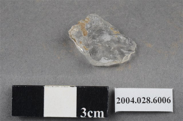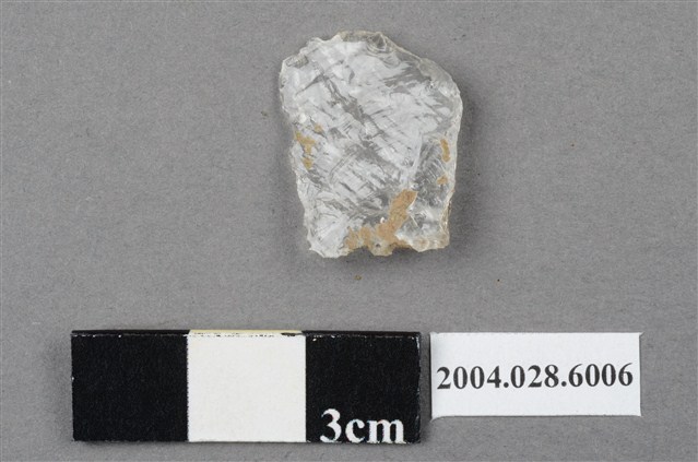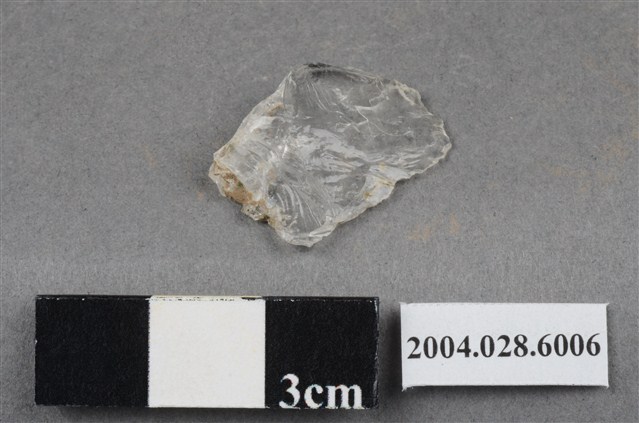 本件為花蓮支亞干遺址採集之小石片器,長2cm、寬1.6cm、厚0.5cm,器型不規則,為兩極工法製造,側邊有明顯二次修整痕跡,未見使用過的痕跡。