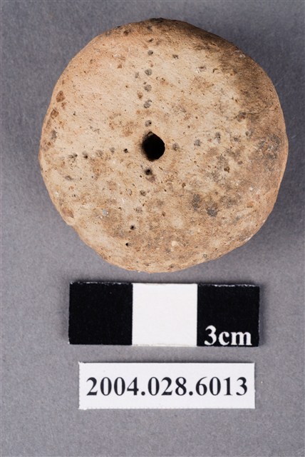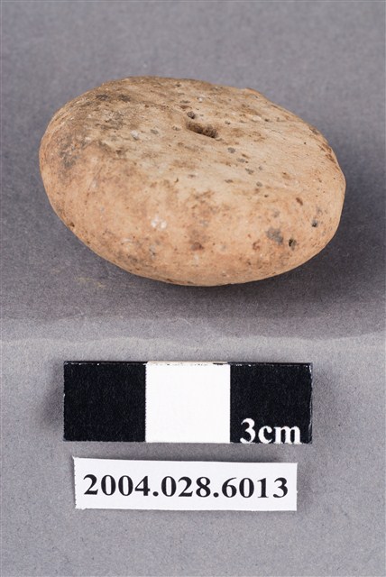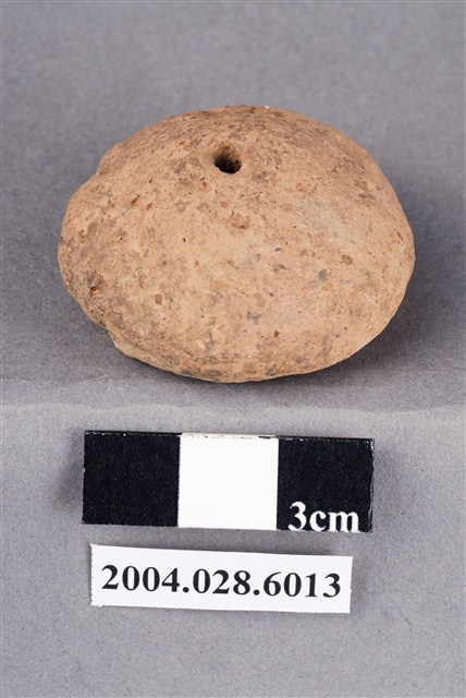 1.本件為花蓮港口遺址採集之陶紡輪,為夾砂紅陶,使用夾雜大量板岩等變質岩粗砂的陶土燒製而成,顯然是外來的物品,表面可見細小砂粒。型制為圓錐形,直徑3.8cm、厚2cm,錐體部分僅單面且表面圓鼓。器物底面壓印實心圓點排列而成的單一圓圈紋結合十字型的紋飾,正中央有一中空圓孔。2.陶紡輪常見於臺灣的史前遺址,為史前人類用來紡線的工具,使用時將圓棒放置於穿孔中,將植物纖維紡成線後再紡織成布使用。由於陶紡輪埋藏地層中數千年,木質部分已經腐爛不見,只有陶質部分遺留下來。