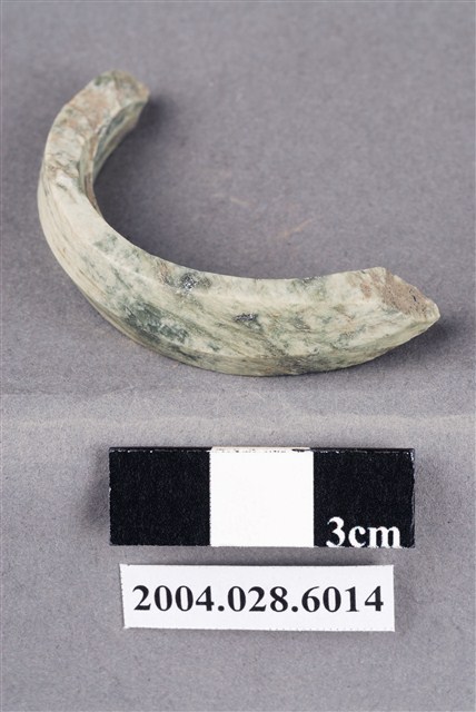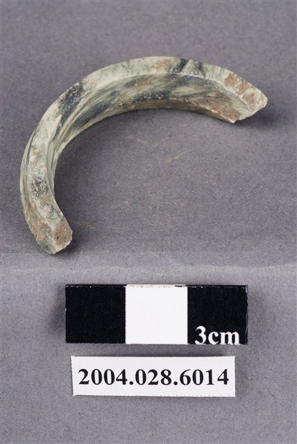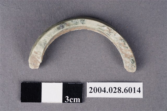 1.本件為花蓮支亞干遺址採集之磨製玉環,已經殘斷,僅存半件,材質為綠色閃玉,長5.1cm、寬2.5cm、厚1cm,器物經圓形旋截加工而成,因此上下兩面較中間窄細,表面僅稍作修整,仍可見旋截痕跡。2.石環常見於臺灣的史前遺址,但出土數量並不多,為史前人類的裝飾品,直接配戴在手上,不僅在日常生活中配戴,也會用來作為陪葬品。