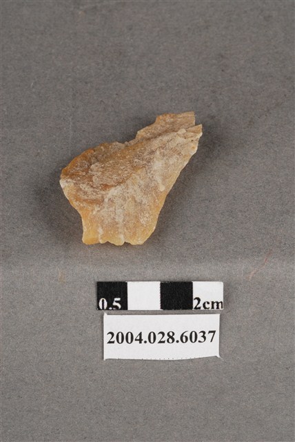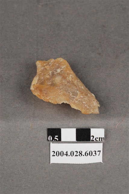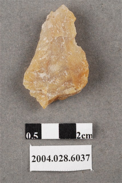 本件為花蓮港口遺址採集之凹刮器,長2.5cm、寬1.9cm、厚0.5cm,器形不規則,為天然裂解成片狀,但未經打磨,一面拱突,往周緣變薄,未見使用過的痕跡。