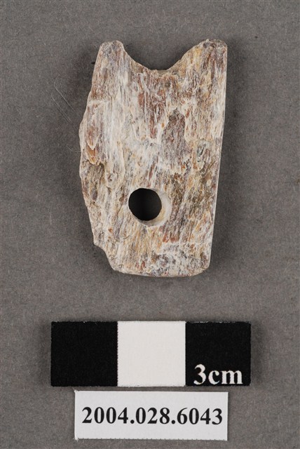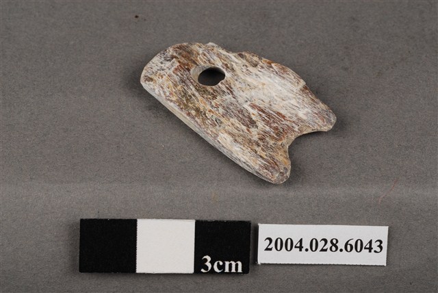 1.本件為花蓮港口遺址採集之帶穿石片,材質為褐色蛇紋岩,長3.6cm、寬2.1cm、厚0.4cm,器形近長方形,器身經加工整磨,周緣亦作修整,有一圓形的漏斗形穿孔。2.本件器物經加工鑿出一孔,可能為裝飾品,以線繩穿成項飾配戴在身上裝飾。由於埋藏於地層中千年以上,有機質已經腐朽不見,只有石質部分遺留下來。