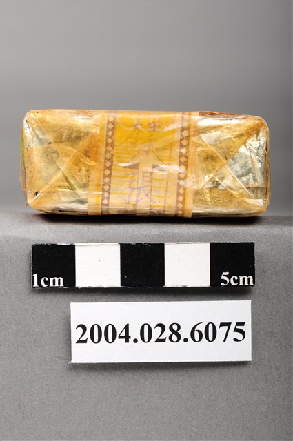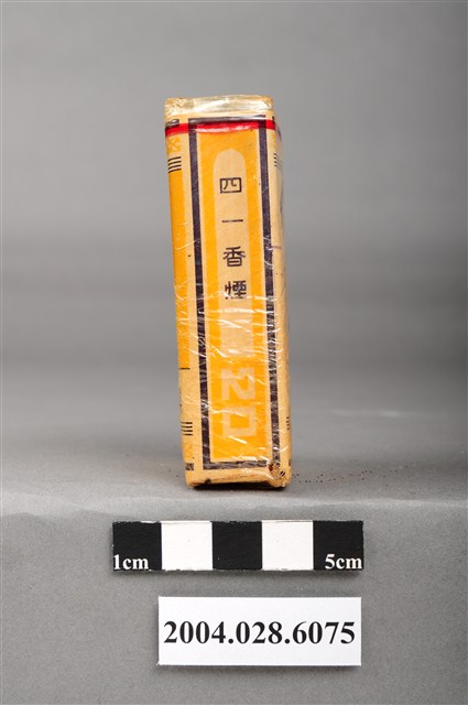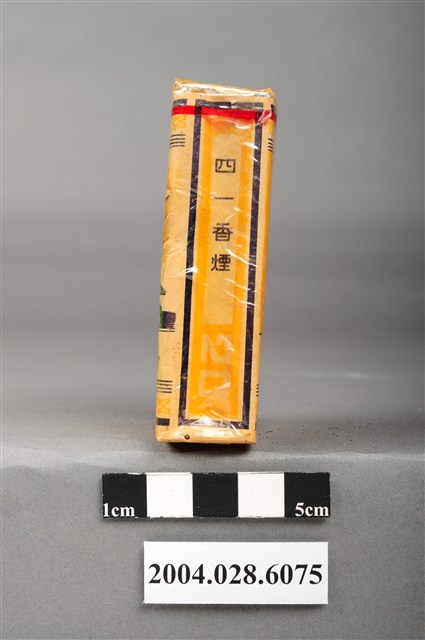 1.本物件為臺灣省菸酒公賣局代製四一香煙,為紙盒包裝,為四方體,其主要標示面中,其中一面以橘色為底,中上部分有花紋邊框,內有「四一」白色字樣,下方有「聫勤專用 轉售充公」黑色字樣,另一面以白色為底,中央有駱駝、椰子樹、太陽之圖像,並有「台灣省菸酒公賣局代製」黑色字樣,其兩側側邊則有「四一香菸」黑色字樣、「20」白色字樣,菸盒開封處有紙條黏貼封住,物件有塑膠包裝所包覆。