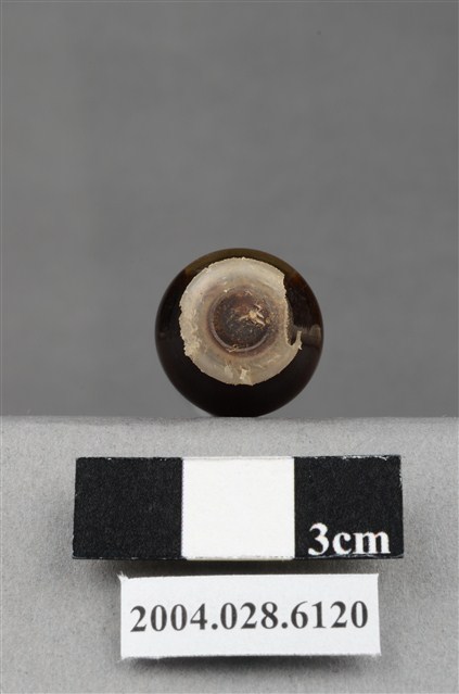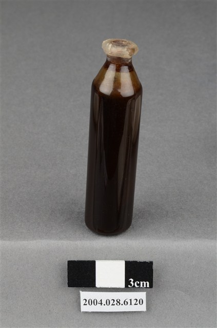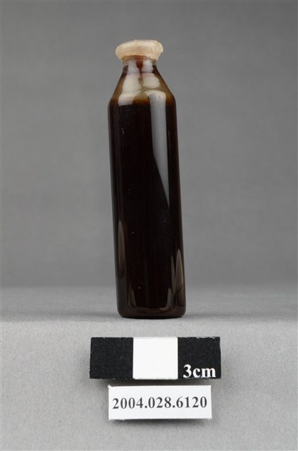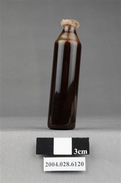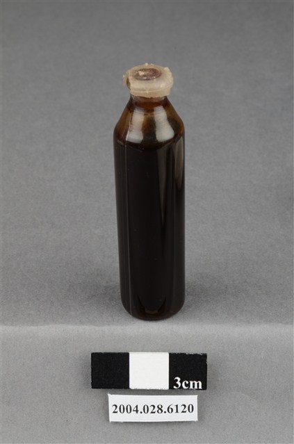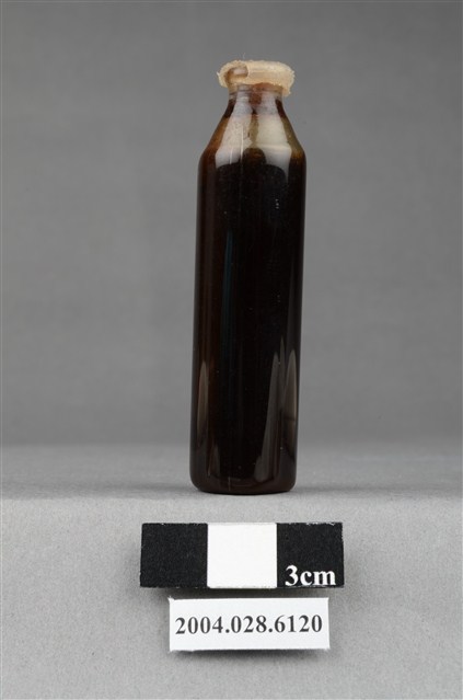 本物件為藥水。有透明蓋封住瓶口,瓶身為透明,瓶身呈圓柱狀,接近瓶口處漸變窄,瓶身無任何標籤或文字。瓶內有深色液體,約十分之九瓶。