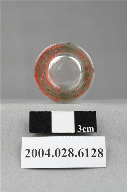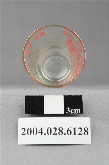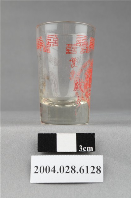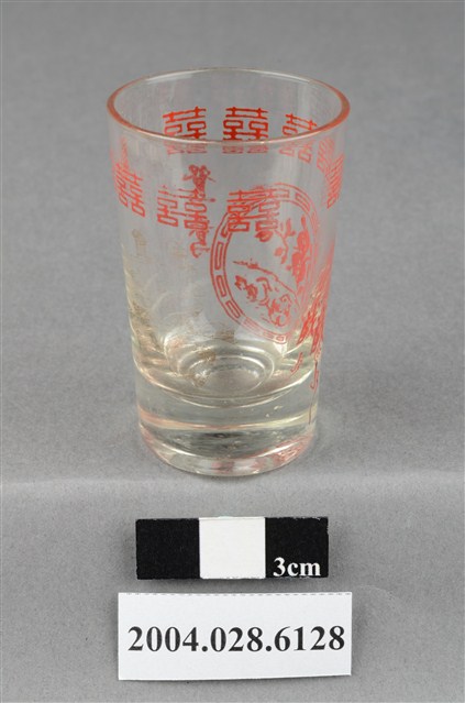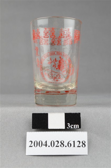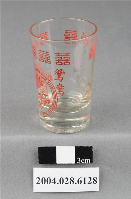 1.此件玻璃杯由透明玻璃製成,整體呈圓柱形,長約3.5公分,寬約3.5公分,高約公分5.6。外型由杯緣開始向下微縮至杯,杯底厚實。杯身上緣印有一圈紅色的囍字,杯身正面印著紅色圓圈,圈裡為鴛鴦戲水圖,圈外右側印著「鴛鴦」,左側印著「戲水」。杯身背面印著金色的「囍」字,但已褪色不清。2.臺灣在早期民生用器具多由陶、瓷製成,玻璃製品屬珍稀進口物品,多為上層社會人士所用。直到日治時期受總督府西化、現代化的影響下,引進與開發玻璃產業,玻璃製的日常用品才漸普及於社會大眾,而用玻璃杯喝飲料成為一時的風尚流行。