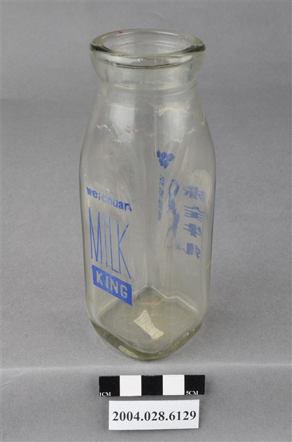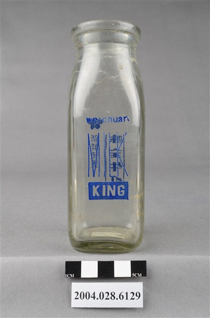 1.此件玻璃牛奶瓶由透明玻璃製成,長約5.1公分,寬約5.1公分,高約14公分。瓶口寬廣微成倒梯形,溜肩,連至瓶身後成四面柱狀至瓶底。瓶身正面印有深藍標誌與文字,標誌為五個排列的圓形,是味全公司的標誌,下有「新鮮營養」與「味全牛乳」的字樣,「味全牛乳」兩側有垂直線條裝飾;背面有「wei·chuang」與「MILK KING」的字樣。側面靠瓶底位置壓有「180cc」的字樣,另一面靠瓶底位置壓有菱形小符號,兩側各有數字字樣,但模糊難以辨識。瓶底部有白色標籤貼,上面用黑筆寫著「7/13TE之」。瓶身上半部有一圈髒污痕跡。2.臺灣在早期民生用器具多由陶、瓷製成,直到日治時期受總督府西化、現代化的影響下,引進與開發玻璃產業,玻璃製的日常用品才漸普及於社會大眾。而牛奶玻璃瓶的出現也與當時的興盛的牛乳飲用風氣有關,十九世紀下半葉,歐美地區的牛乳飲用人口快速增加,於是有鮮乳的商業化銷售,這項風氣也隨著殖民經濟擴張至東亞與南亞地區。在日治時代,牛乳、乳酪、奶油等引入臺灣,也漸開啟了臺人飲用新鮮牛乳的習慣。