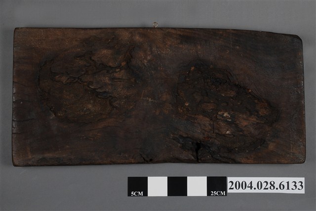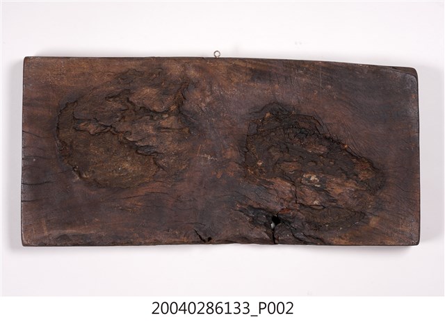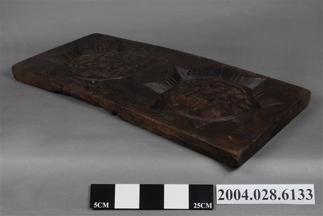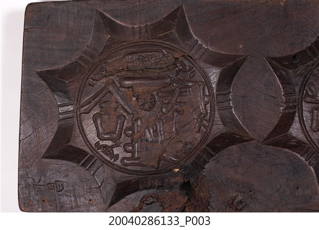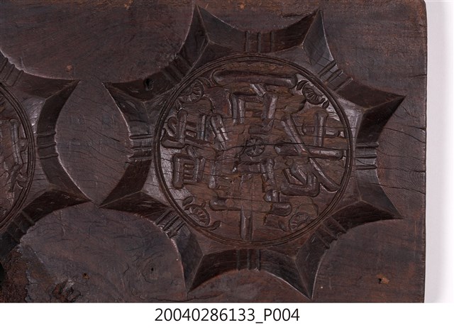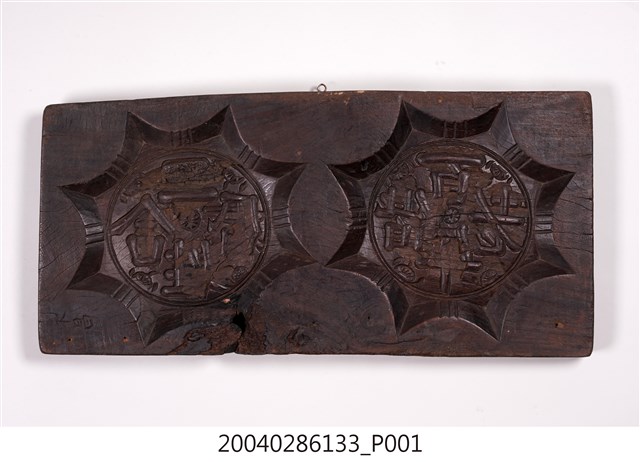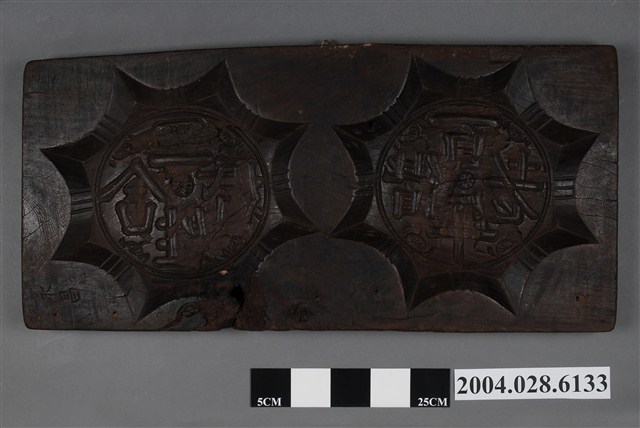 2004.028.6133 黑漆長條板單面雕二枚八角形光芒造形百年偕老二姓合婚糕印