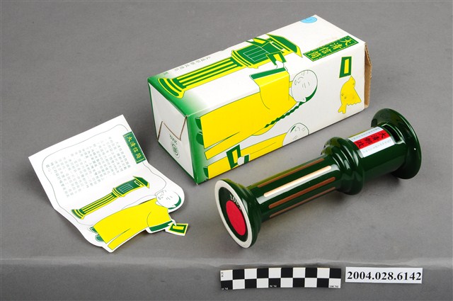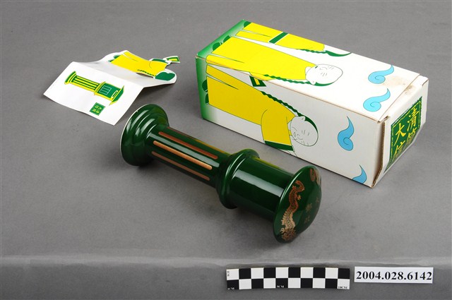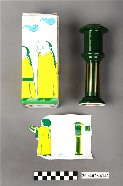 1.本物件為大清信筒,外盒底色為白色,盒上有郵筒的插圖,左下角印著「交通部郵政總局」,盒內的郵筒模型為綠色,上面印著「大清郵政」,另外還有一張關於大清信筒的介紹小卡。
