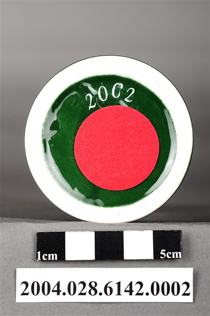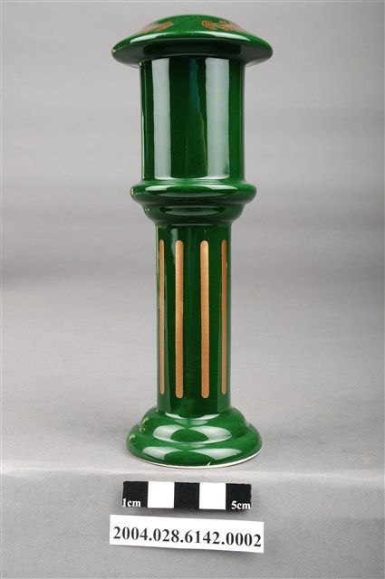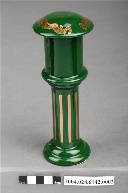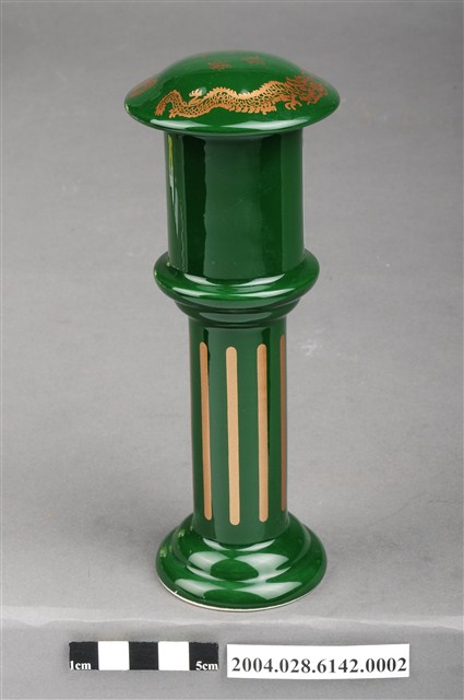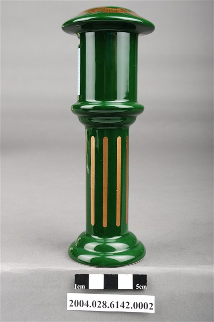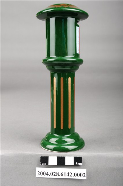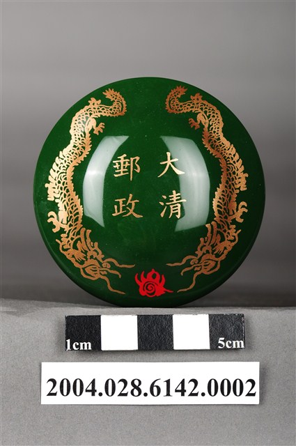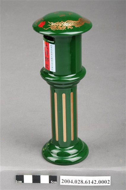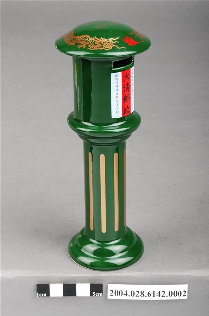 本物件為大清信筒,盒內的郵筒模型為綠色,桶身上有金色的直線裝飾,正面印著「大清郵政」,郵筒頂部也印著「大清郵政」,旁邊還有龍的花紋裝飾,底部貼著紅色的圓紙,並印著2002。