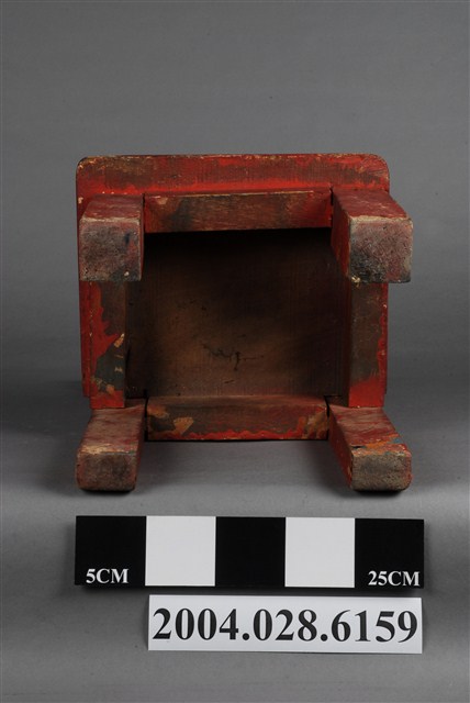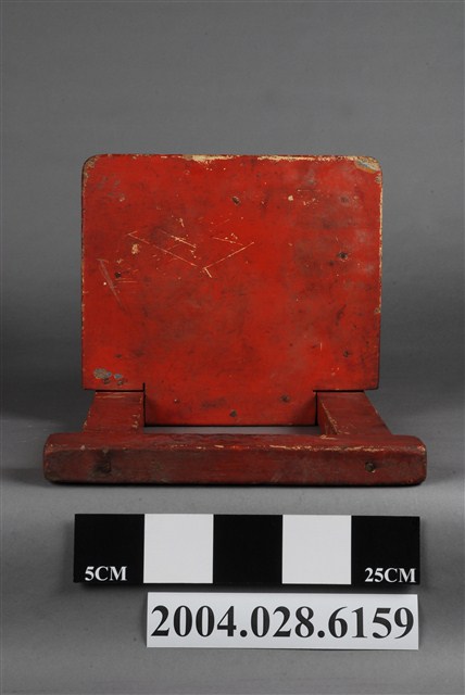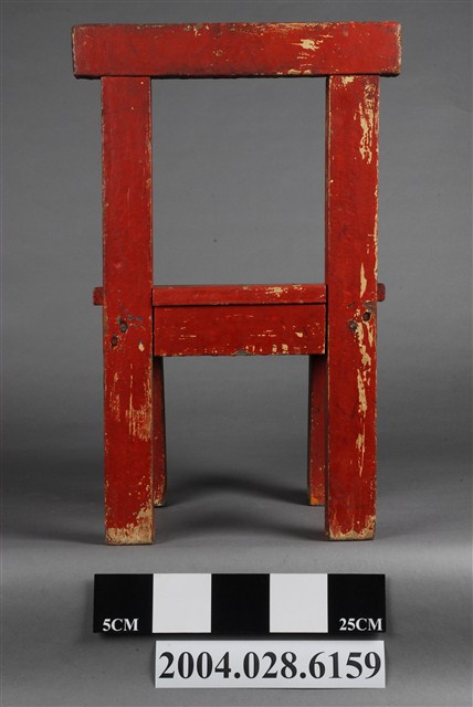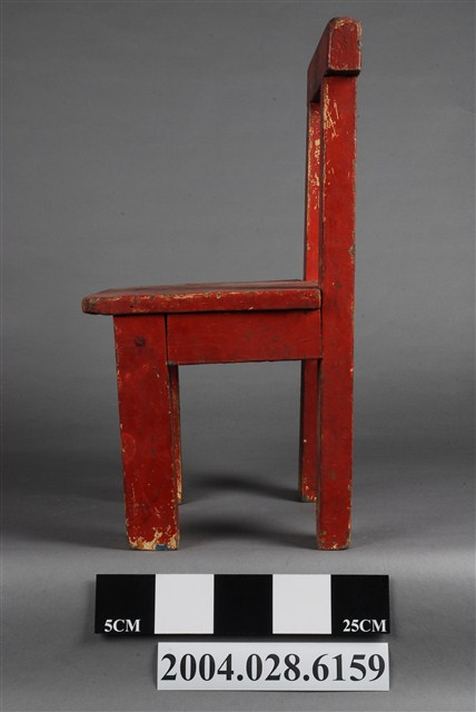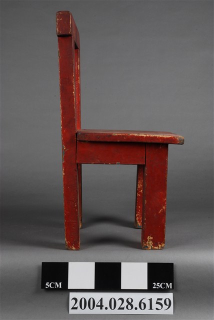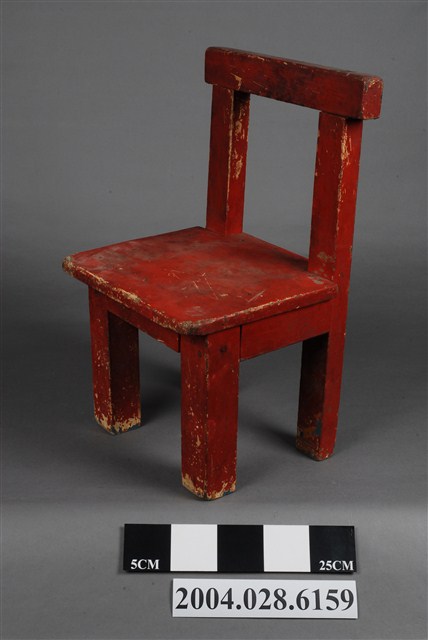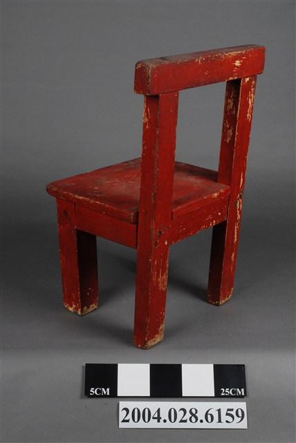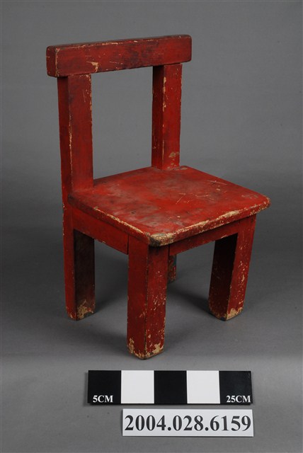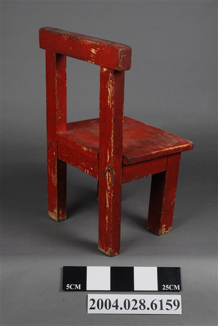本件為木製兒童椅,長27.8公分、寬24.3公分,高45.5公分。最上方為方直的橫向靠背,下方連接兩根縱向方材,直下底部成為腿足。方形的椅面前方有兩腿足,椅面下方、四足間有橫棖直接連接各部件,同時承重。通體施以紅漆,整體線條方直,不施裝飾,給人結實質樸耐用之感。
