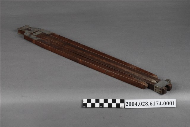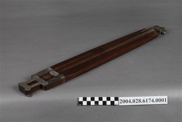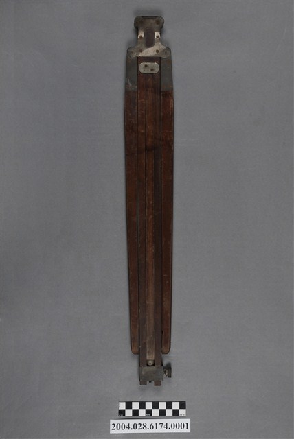 本件藏品是一只木製相機腳架伸縮腿,是館藏編號「2004.028.6174」一組三件相機腳架組之一,和同組另兩件館藏編號為「2004.028.6174.0002」、「2004.028.6174.0003」之伸縮腿型制、尺寸皆為相同,為三截式設計,可依需要伸縮調整高度,伸縮關節處均包覆金屬以強化卡榫固定。使用時將三根伸縮腿上端勾在相機下方所附之可轉動圓盤上,便可三點固定相機進行拍攝。