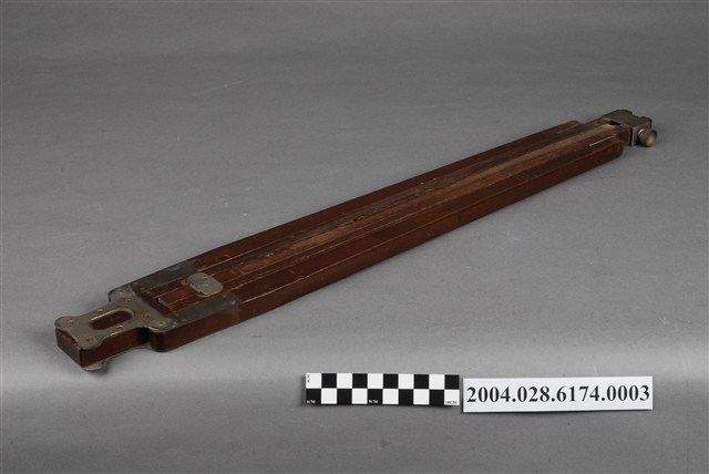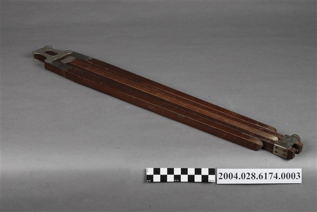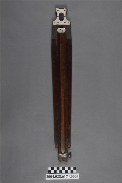本件藏品是一只木製相機腳架伸縮腿,是館藏編號「2004.028.6174」一組三件相機腳架組之一,和同組另兩件館藏編號為「2004.028.6174.0001」、「2004.028.6174.0002」之伸縮腿型制、尺寸皆為相同,為三截式設計,可依需要伸縮調整高度,伸縮關節處均包覆金屬以強化卡榫固定。使用時將三根伸縮腿上端勾在相機下方所附之可轉動圓盤上,便可三點固定相機進行拍攝。