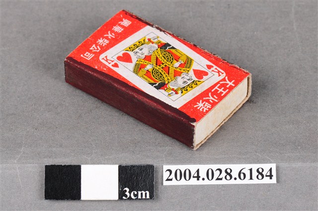 1.本物件為大王火柴黑桃K愛心K圖樣火柴盒,外部有撲克牌中的黑桃K圖樣及愛心K,內有火柴 2.火柴又稱為「洋火」、「番仔火」,透過摩擦火柴頭和火柴盒的磷面產生火苗,在打火機和瓦斯不普遍的年代,火柴是不可或缺的民生用品,由於使用率高一般商家也將火柴盒印上廣告達到宣傳效果。