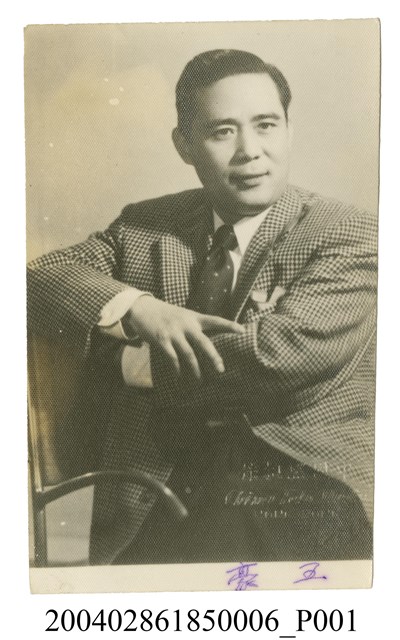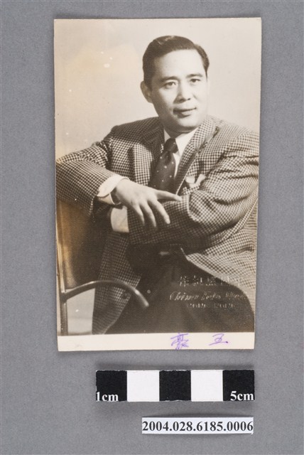 1. 王豪明星黑白沙龍照。相紙材質半身照。王豪穿西裝打領帶,深色長褲,坐在椅子上雙手橫在前,看向左前方。照片上有「中國照相館」字樣,以及無法辨識的英文字兩行(推估是照相館的英文名),照片下方有條狀空白相紙,上有藍色筆寫「王豪」二字。背面有藍筆寫「王豪」二字,另有鉛筆寫「C44」。照片狀況良好。2. 王豪1917年生,1935即當上了電影演員,七七事變後到了重慶進入中國電影製片廠,主演了多部抗戰題材的影片。1946年應香港大中華公司之邀到香港,拍攝多部膾炙人口的影片,如《某夫人》、《秋瑾》。與影星陳燕燕結婚,自組海燕電影公司。他也參與《筧橋英烈傳》演出。