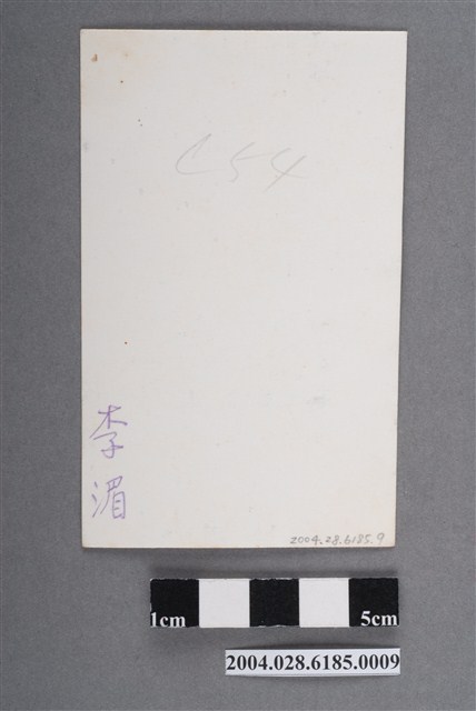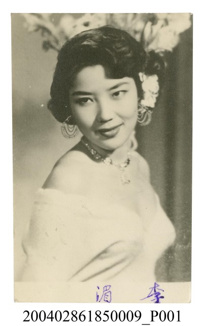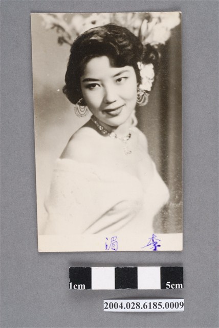 1. 李湄明星黑白沙龍照。相紙材質半身照。李湄身穿露肩上衣,側身向左,短髮上戴有髮飾,耳戴金屬圈耳環,脖子上有寶石項鍊,微笑看向右前方。背景有窗簾。照片下方有條狀空白相紙,上有藍色筆寫「李湄」二字。背面有藍色筆寫「李湄」二個字,另有鉛筆寫「C64」。2. 李湄原名李景芳,學名李桂芳,曾擔任「民生影業公司」編劇,撰寫的第一部劇本為〈黃金世界〉。1952年,以「李倩」之名參加「香港小姐」選美受到矚目而於1953年投入影壇,陸續主演《流鶯曲》、《黃金世界》、《名女人外傳》等十多部電影,合作對象以獨立制片公司為主,常演出冷艷少婦。