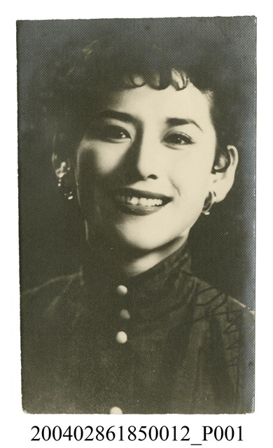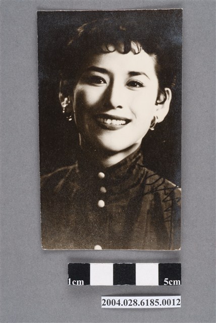 1. 王萊明星黑白沙龍照。相紙材質頭像照。深色背景前王萊身穿深色上衣,短髮捲瀏海,耳戴金屬圈耳環,露齒笑著看著鏡頭。照片上有「王萊」二字簽名。背面有藍色筆寫「王萊」二個字,另有鉛筆寫「C180」、「王萊」。照片狀況良好,僅有細微白點。2. 王萊原為話劇演員,1951年投身影壇,首部作品為上海大同公司出品的《神龕記》,但遭禁映。1952年到香港定居發展,先後參演超過一百部電影,有「千面女星」的美譽,在她長達半個世紀的演藝生涯中,曾四次奪得臺灣金馬獎最佳女配角獎,包括《人之初》、《小葫蘆》、《海峽兩岸》及《推手》。