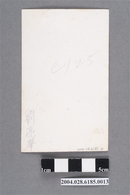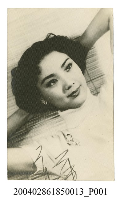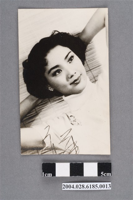 1. 劉亮華明星黑白沙龍照。相紙材質頭像照。在推估為竹簾的背景前,劉亮華短髮戴金屬材質耳環,身穿白色毛線短袖上衣並戴著寶石胸針,以近似斜躺的姿勢,雙手枕在頭後,帶著一抹微笑眼睛看向上方。照片上有「亮華」二字簽名。背面有藍色筆寫「劉亮華」三個字,另有鉛筆寫「C125」。照片上有些許髒污。2. 劉亮華為香港電影演員,參演《七姐妹》進了影壇,橫跨國語片和粵語片。林青霞曾說她入電影界是被劉亮華的光環所吸引。她曾替嘉禾公司赴美國成功邀請李小龍加入嘉禾,並與其合演《唐山大兄》,開啓了李小龍在香港輝煌的演藝事業。