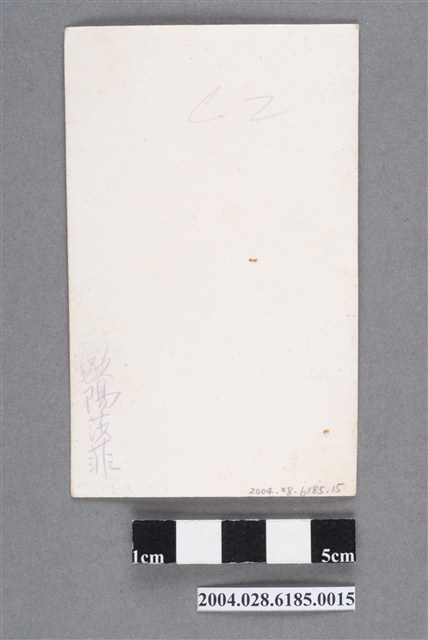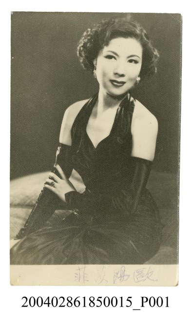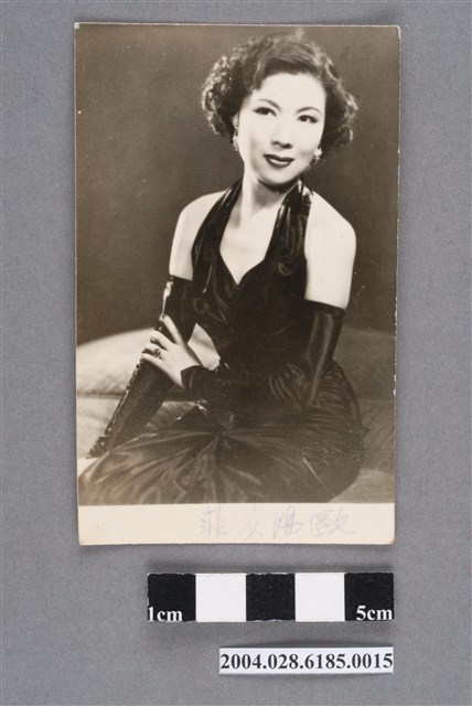 1. 歐陽莎菲黑白沙龍照。相紙材質半身照。歐陽莎菲坐在沙發上,身穿露肩黑色長袖禮服,短髮,戴碎鑽耳環看向左前方,左手無名指上有寶石戒指,左手搭在右手臂上。下方有一條相紙空白,上有藍色筆寫「歐陽莎菲」四字。背面有藍色筆寫「歐陽莎菲」四個字,另有鉛筆寫「C2」。照片狀況良好。2. 歐陽莎菲本名錢舜英,電影演員。1941年進入中國影壇,以擅飾反派角色聞名,1946年主演中電攝制的抗戰間諜片《天字第一號》曾創下當年最高票房賣座記錄,也是臺灣版白虹主演的《天字第一號》的原版。1949年赴香港拍攝電影並擔任主要演員。1960年以電懋公司的影片《母與女》獲第7屆亞洲影展最佳女配角獎。1968年以電影《烽火萬里情》獲得金馬獎最佳女配角獎。1993年獲臺灣第三十屆金馬獎紀念獎。