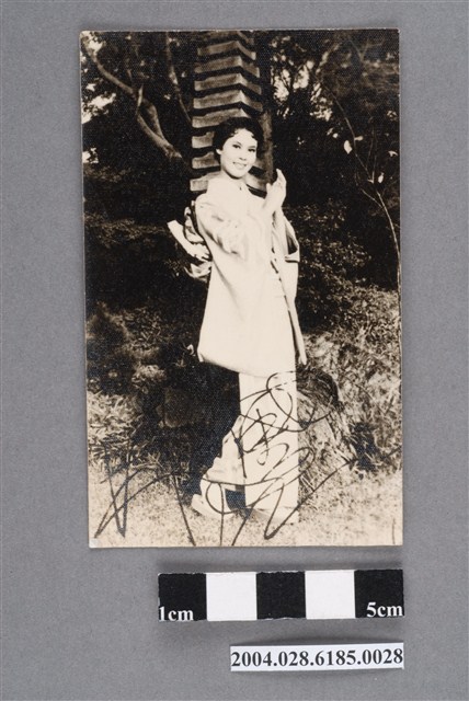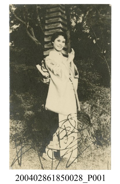 1. 林黛明星黑白沙龍照。相紙材質全身照。照片看似在日本風景區拍攝,林黛身穿日本淺色和服,站在一個小塔前,露齒笑著看向鏡頭,雙手擊掌狀。下方有「林黛」二字簽名。背面有鉛筆寫「C349」。照片。2. 林黛本名程月如1953-1964年活躍香港影壇的國語電影女演員,贏得四屆亞洲影展女主角獎殊榮,代表作包括《貂蟬》(1958)、《江山美人》(1959)、《千嬌百媚》(1961)、《不了情》(1961)、《藍與黑》(1966)、《藍與黑續集》(1966)等。1964年自殺,終年29歲。