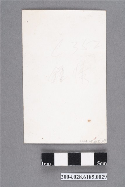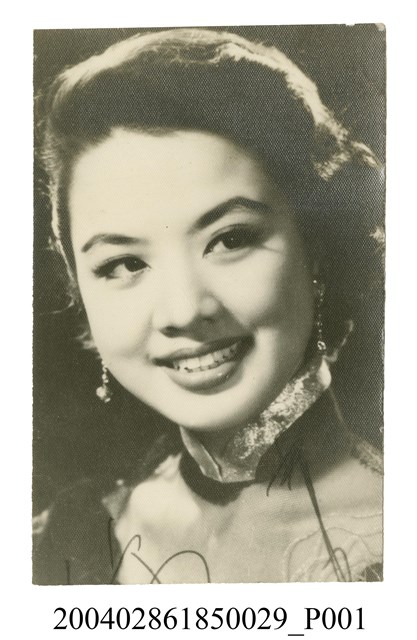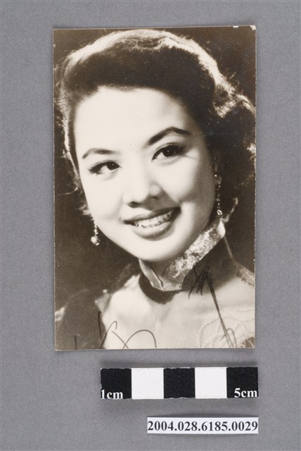 1. 鍾情明星黑白沙龍照。相紙材質頭像照。深色背景前鍾情露齒笑著看向左前方。及肩的捲髮,帶著微笑,臉朝左微低。耳戴垂珠耳環,身穿閃亮衣領的服裝(推估為表演裝扮)。照片上有無法辨識類似簽名的字樣。背面有鉛筆寫「鍾情」二字以及「C352」。照片狀況良好。2. 鍾情為香港影歌星,曾主演《七姊妹》、《桃花江》等電影而走紅;所唱歌曲開始名揚東南亞,並獲得了“小野貓”的稱呼。其他演出作品包括《給我一個吻》、《阿里山之鶯》等。