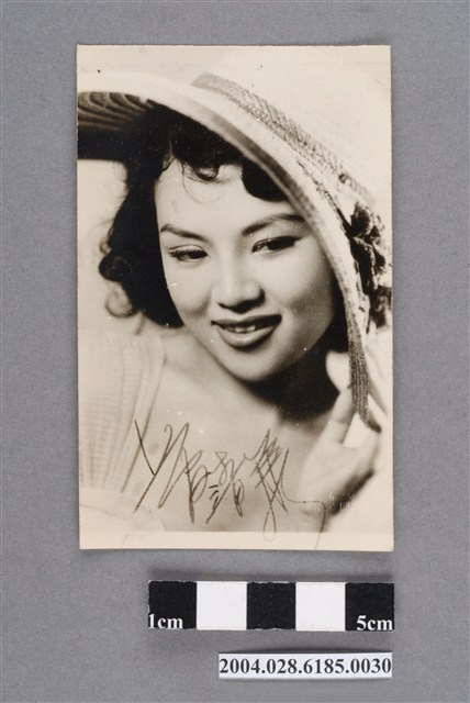 1. 上官清華明星黑白沙龍照。相紙材質頭像照。上官清華頭戴寬邊草帽,左手扶著帽沿,微笑著看向左下方。照片上有「上官清華」簽名字樣。背面有鉛筆寫「上官清華」字樣。照片表面多處有小白點,下方有刮痕。2. 上官清華本名嚴淑芸,為藝華公司創辦人嚴春華的幼女。曾自創清華影業公司拍攝自己主演的《新漁光曲》(1955)。影片為上映即因感情與財務問題服藥自殺,幸獲救。