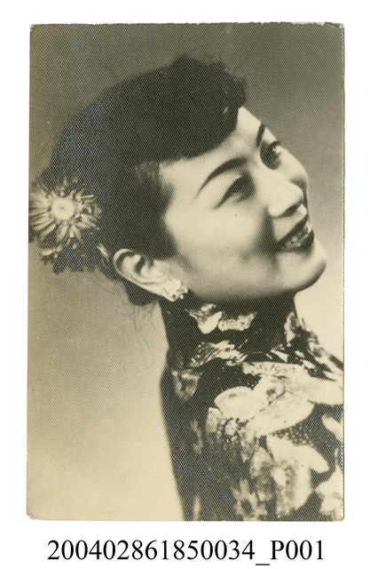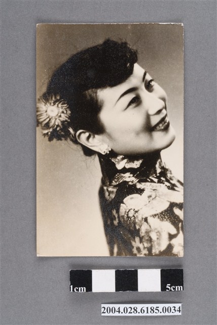 1. 焦鴻英明星黑白沙龍照。相紙材質頭像照。焦鴻英短髮插著大花髮釵,戴珠鑽耳環,身穿花旗袍,側身面向左方,帶著微笑臉為朝右看。背面有鉛筆寫「焦鴻英」與「C332」字樣。照片狀況良好。2. 焦鴻英,民國時期上海京劇業餘名伶、香港影星。曾拜在京昆名伶俞振飛及京劇大師梅蘭芳門下。1948年演出以戲曲演員生活為題材的影片《美艷親王》走紅,因而有「美艷親王」的綽號,成為電影、京劇雙棲明星。主演的電影作品不多,移居臺灣後曾教授蔣經國夫婦京劇。