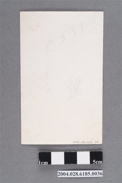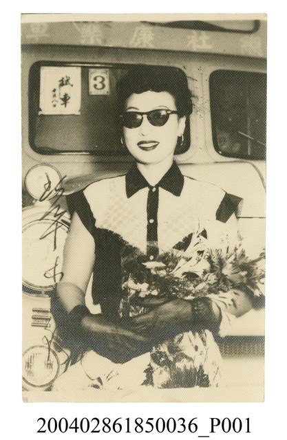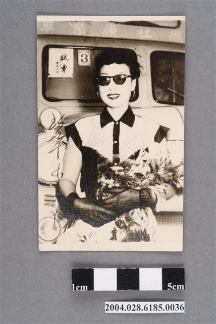 1. 李麗黑白明星照。相紙材質半身照。李麗身穿深淺色搭配上衣,戴太陽眼鏡大耳環,手戴黑紗手套,捧花束。背景空間裡有「總社康樂車」、「試車」、「3」標示,推估是一活動場合。照片上有三個無法辨識的黑色筆寫字。背面有鉛筆寫「李麗」與「C331」字樣。2. 李麗活躍於1930~40年代的舞女、影星與京劇名伶。曾當選「上海舞后」,拍攝《一代尤物》,「一代尤物」也成為她的封號之一。她也為軍統局工作擔任間諜,與戴笠有一段情並育有一子。