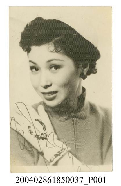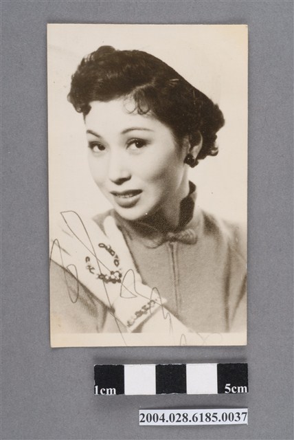 1. 于素秋明星沙龍照。相紙材質頭像照。于素秋戴帽(因曝光過度帽子無法辨識)側臉微笑看向前方。左手戴著有圖案的厚手套搭在右肩上。耳戴深色大珠型耳環。照片左下角有「于素秋」三個字簽名,下方有一條相紙空白處。背面有鉛筆寫「C279」字樣。照片狀況良好,有些許白色小點。2. 于素秋原名于鳳,是1950、1960年代香港影星。父親是著名京劇名武生于占元,1948年開始從影,曾主演超過200部影片,期中170多部是武俠片,包括粤語武俠片經典影片《如來神掌》。