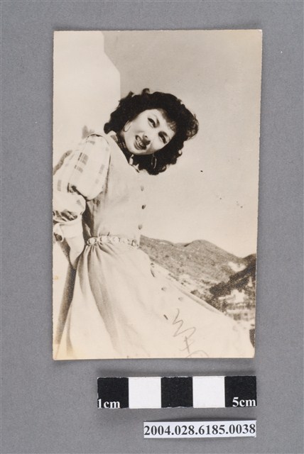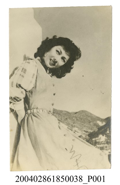 1. 翁木蘭黑白明星照。相紙材質全身照。翁木蘭在背景有山的空曠戶外石牆前,身穿格子襯衫與連身裙,低頭微笑看向右前方。照片上有筆寫字跡,推估為「翁木蘭」簽名。背面有鉛筆寫「C251」字樣。照片右邊有些許髒污。2. 翁木蘭本名翁梅影,1949年移居香港。演出影片40餘部,其中擔任主演的影片有《人鬼戀》《千金小姐》、《後門》、《丈夫的秘密》等。